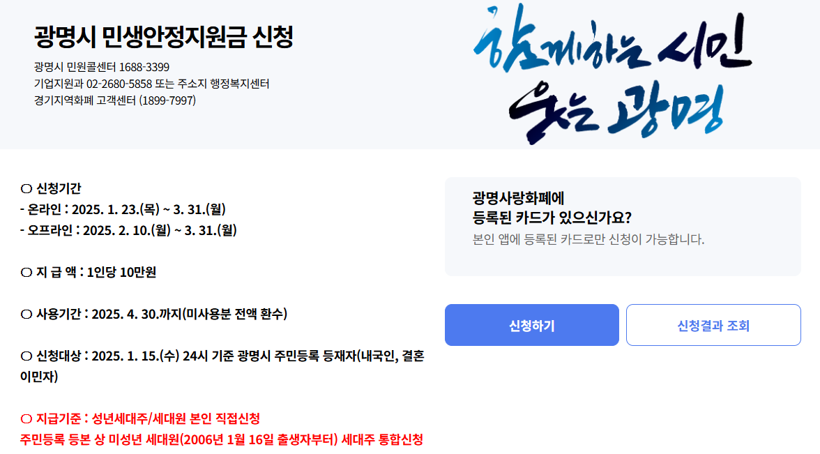 - 지급대상: 2025년 1월 15일 기준으로 광명시에 주민등록이 등재된 시민 (내국인 및 결혼이민자 포함)