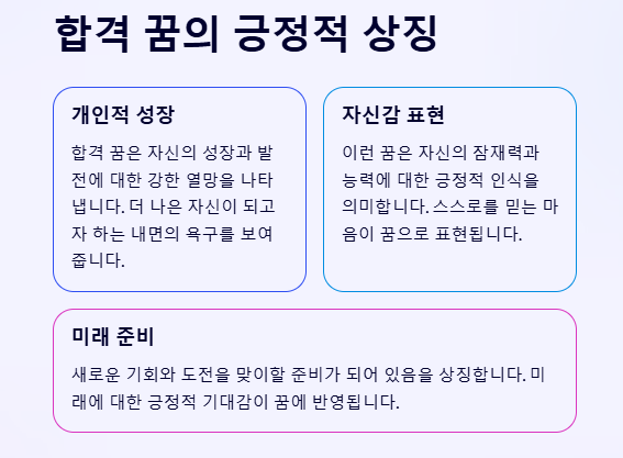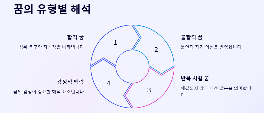 - ✅ 시험 합격: 도전 과제 극복과 성취를 의미하며, 현재의 노력과 준비가 결실을 맺고 있음을 나타냅니다.