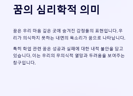 | 시험장에서 답안 작성하는 꿈 | 노력과 준비 과정 | 현재 진행 중인 과제나 프로젝트에 대한 반영 |