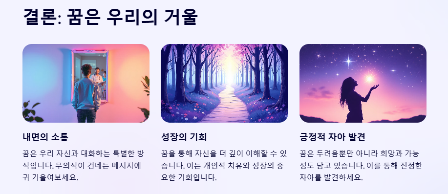 꿈은 단순한 환상이 아니라 우리의 내면 세계를 비추는 거울입니다. 이를 통해 자신을 더 깊이 이해하고, 더 나은 미래를 설계하는 데 활용할 수 있습니다.