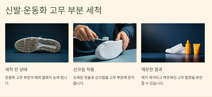 • 👟 신발 아웃솔·운동화 얼룩 청소: 신발의 더러워진 테두리에 선크림을 바르고 부드럽게 문질러 닦은 뒤 물티슈로 마무리하면 세탁 없이도 깔끔해집니다.