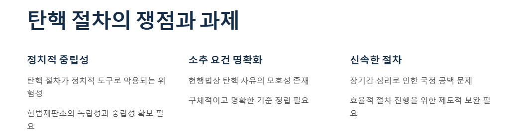 - 기각: 본안 심리를 통해 탄핵 사유가 부족하거나 법적 근거가 충분하지 않다고 판단될 때 내리는 결정입니다. 이는 동일한 사유로 다시 탄핵할 수 없게 합니다.