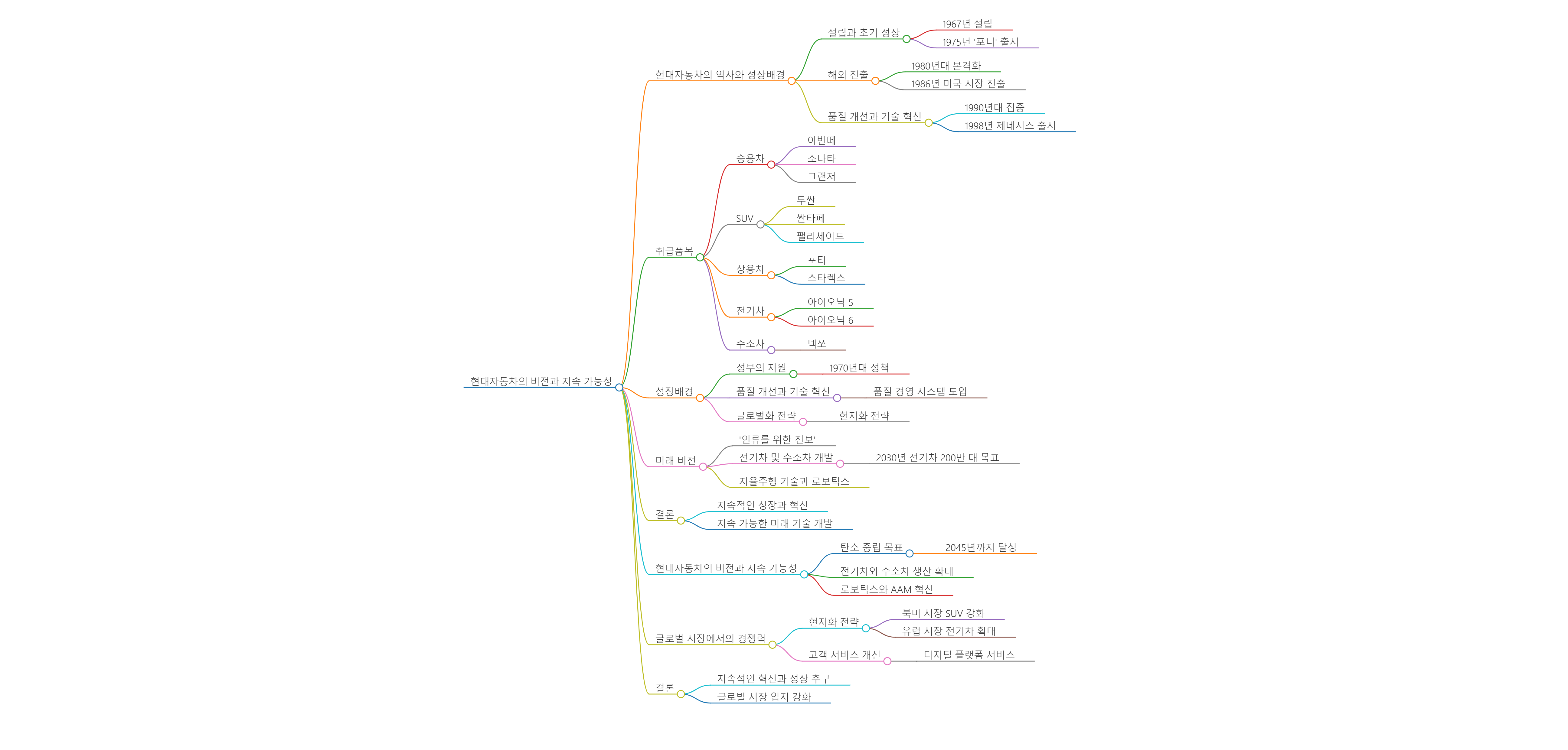 현대자동차는 지속 가능한 미래를 위해 다양한 전략을 추진하고 있습니다. 특히, 2045년까지 탄소 중립을 달성하기 위한 목표를 세우고, 이를 위한 구체적인 계획을 수립하고 있습니다. 현대자동차는 전기차와 수소차의 생산을 확대하고, 재생 가능 에너지를 활용한 생산 공정을 도입하여 환경 영향을 최소화하고자 합니다.